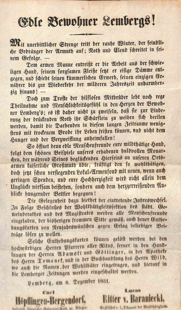(…) Solche Enthebungskarten können gelöst werden bei bei den hochwürdigen Pfarrern aller Ritus, ferner in den Handlungen der Herren Adamski und Göttinger, in der Apotheke des Herrn Tomanek und in der Buchhandlung des Herrn Wild, wo auch die Namen der Wohltäter eingetragen, und hierauf in die Lemberger Zeitungen werden eingeschaltet werden.(…)